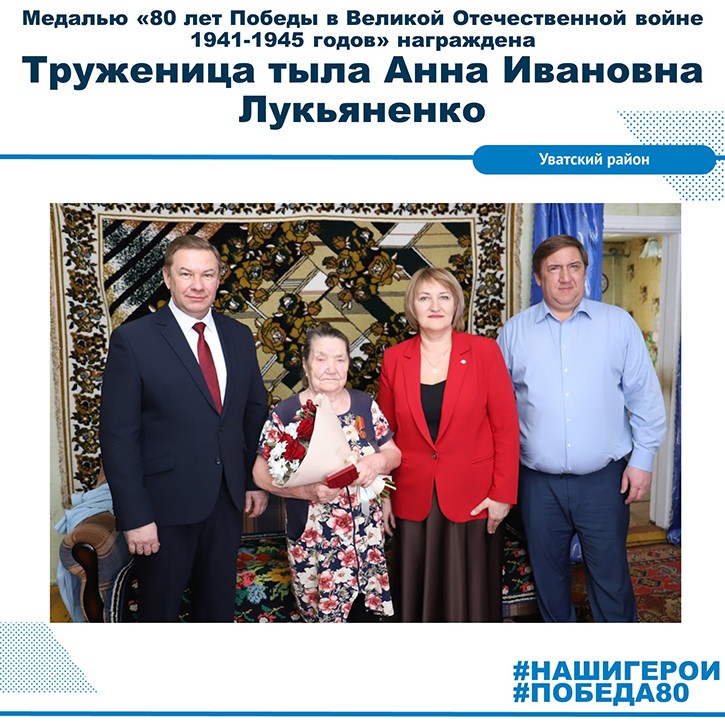 ?Труженица тыла Анна Ивановна Лукьяненко удостоена медали «80 лет Победы в Великой Отечественной войне 1941-1945 гг.», учрежденной Президентом России Владимиром Путиным.